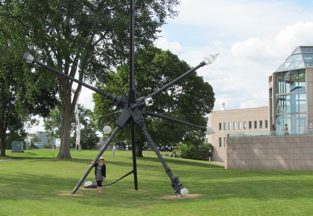 I remember this sculpture on the cover of Canadian Art magazine's special sculpture issue of December 2011. Michel de Broin selected damaged streetlights for his Majestic, named after a funeral home in new Orleans where he was born. The sculpture repurposed broken pieces into something new, giving hope to the New orleans as people rebuilt the city following Hurricane Katrina. It would be great to see this piece at night with its lamps fully lit! I am standing by one of the posts.
